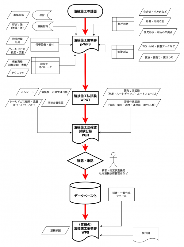 特殊工程である溶接は、材料・人・設備・方法の管理が必要です。それらの組み合わせが適切かどうかは溶接施工法確認試験を行い確認します。各要件(溶接パラメータ)には規格で定められた承認範囲(溶接確認項目)があり、これを逸脱する条件で溶接を計画する場合は新たに確認試験を実施しなければなりません。